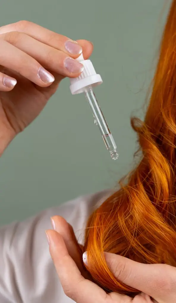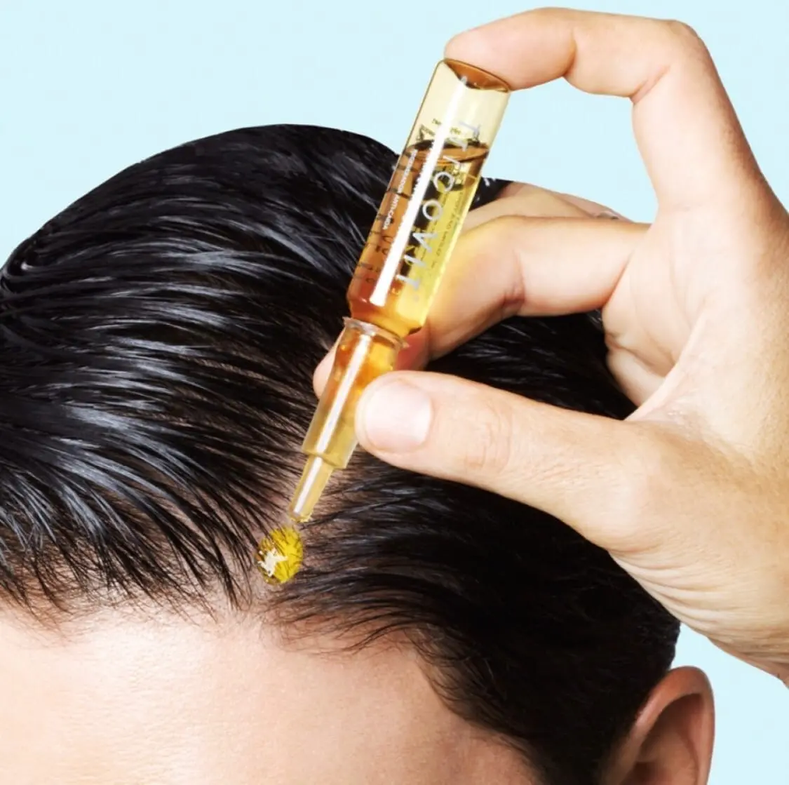 Нанесите около 10–15 капель сыворотки (или 1 ампулу) вдоль проборов — равномерно по всей поверхности кожи головы.